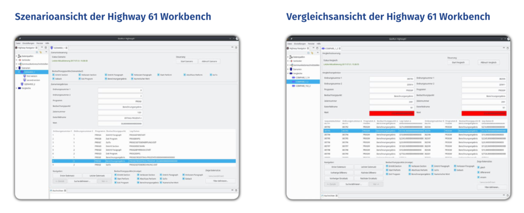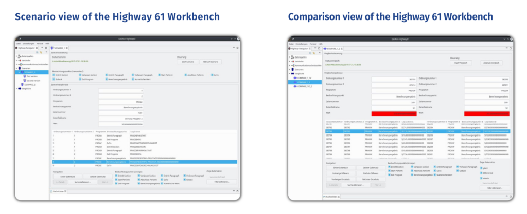 Regression test results primarily evidence the identity of function for different scenarios on different systems or versions. They tend to be easily doable and can be just as easily automated which makes such tests the go-to option for complex software systems. However, this complexity also causes a key weakness of these test procedures: they can only determine whether or not it is highly likely that the system will work as intended and without errors. If errors do occur, system complexity makes it difficulty to pinpoint where they occur, even with detailed knowledge of internal processes. This is where Highway61 comes into play by making it possible to take a closer look at the programmes as they run through scenarios. This enables developers and others to see where and when deviations happen and to examine intermediate results throughout the test. In most cases, this in turns means that the causes of errors can be narrowed down effectively, resulting in saved time and resources spent on troubleshooting and supporting auditing purposes.