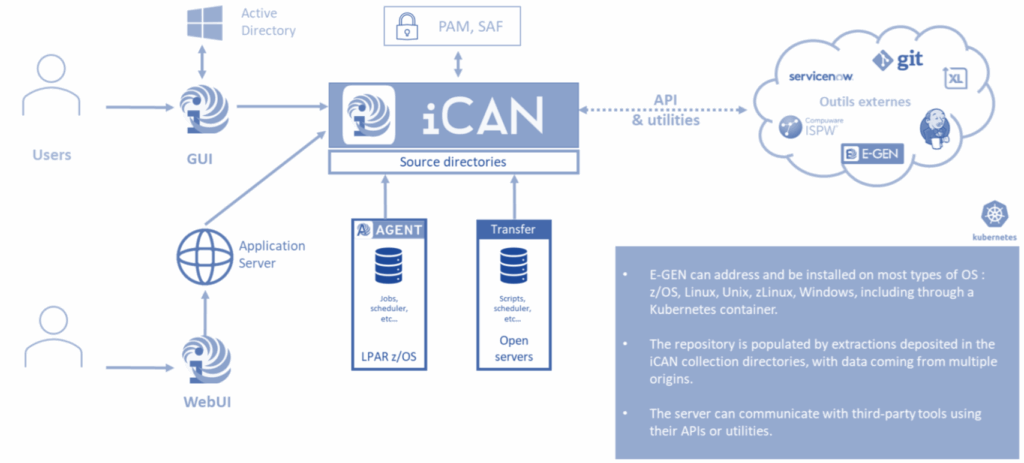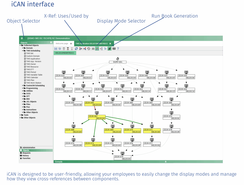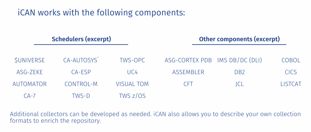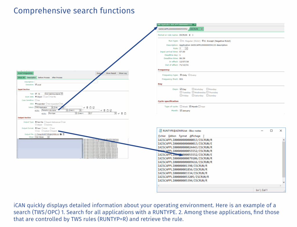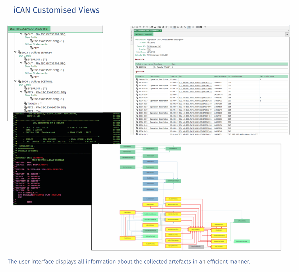 A safe and central repository unlocks understanding of all information within your IT production. The iCAN repository collects basic data and its high-performance query engine then identifies all cross-references and relationships quickly and automatically. Our solution allows your staff to easily conduct detailed searches and to display search results through graphs, diagrams, structured or flat text, or 3270-screens. Every display mode includes hyperlinks, enabling easy navigation and collection of as much information as necessary about any sequence, entity, relationships, or data flow. iCAN displays precise information about scripts, JCL, schedulers, files, calendars, data transfers – anything you want to include. You can also include your search results within the repository as new objects to create new queries. The software can be installed on z/OS, Linux, or Windows operating systems. In each case, the installation uses pre-existing components from within your infrastructure. Files can be exported in XLS, XML, HTML, or text formats. Our solution quickly translates even the most complex operating information into a format that can easily be used and understood by your end users, including staff without programming knowledge.
