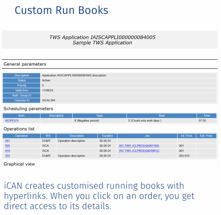 Our software was built to quickly find information needed for comprehensive technical analyses and audits. Upon entry of your search criteria, iCAN’s query engine uses data modelling to complete your query. With just one click all links and relationships between collected objects are displayed. Analysis and audit reports can be formatted in HTML or in Word. iCAN shows links between objects and/or schedulers, resources used, time elapsed, planning definitions, task structures, interactions between systems, and many other aspects of your processes. It is highly valuable for checking source and target paramaters and for controlling norms and standards in your operating environment.