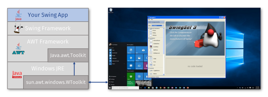 The Swing API is designed to be cross-platform, i.e. all interactions with platform-dependent functions take place via a clearly defined minimal interface (java.awt.Toolkit).