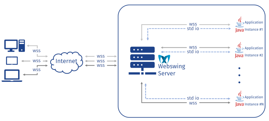 The Webswing server can run on a local machine, on-premise, in the cloud or even as a container in a Docker or Kubernetes environment.